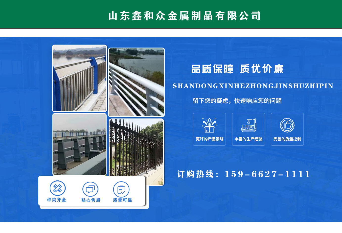 山東鑫和眾金屬制品有限公司主要產品有防撞護欄,橋梁護欄,道路護欄,河道護欄,不銹鋼護欄等護欄。提供設計方案,一站式定制,包您滿意價格優(yōu)惠,歡迎來電咨詢! 公司常年從事銷售護欄防撞護欄,橋梁護欄,道路護欄,河道護欄,不銹鋼護欄,橋梁鋼護欄,河道燈光護欄等。產品廣泛應用于橋梁、河道、旅游景區(qū)、道路、公路、公園、小區(qū)、景觀、道路防撞等領域?! 」井a品均采用優(yōu)質不銹鋼材料,符合相關標準。各種型號不銹鋼復合管及護欄,質量嚴格把控。產品強度高、耐腐蝕、焊接牢固、抗沖擊、性能好,防撞護欄結構簡單、美觀實用大方?! g迎前來訂購!...